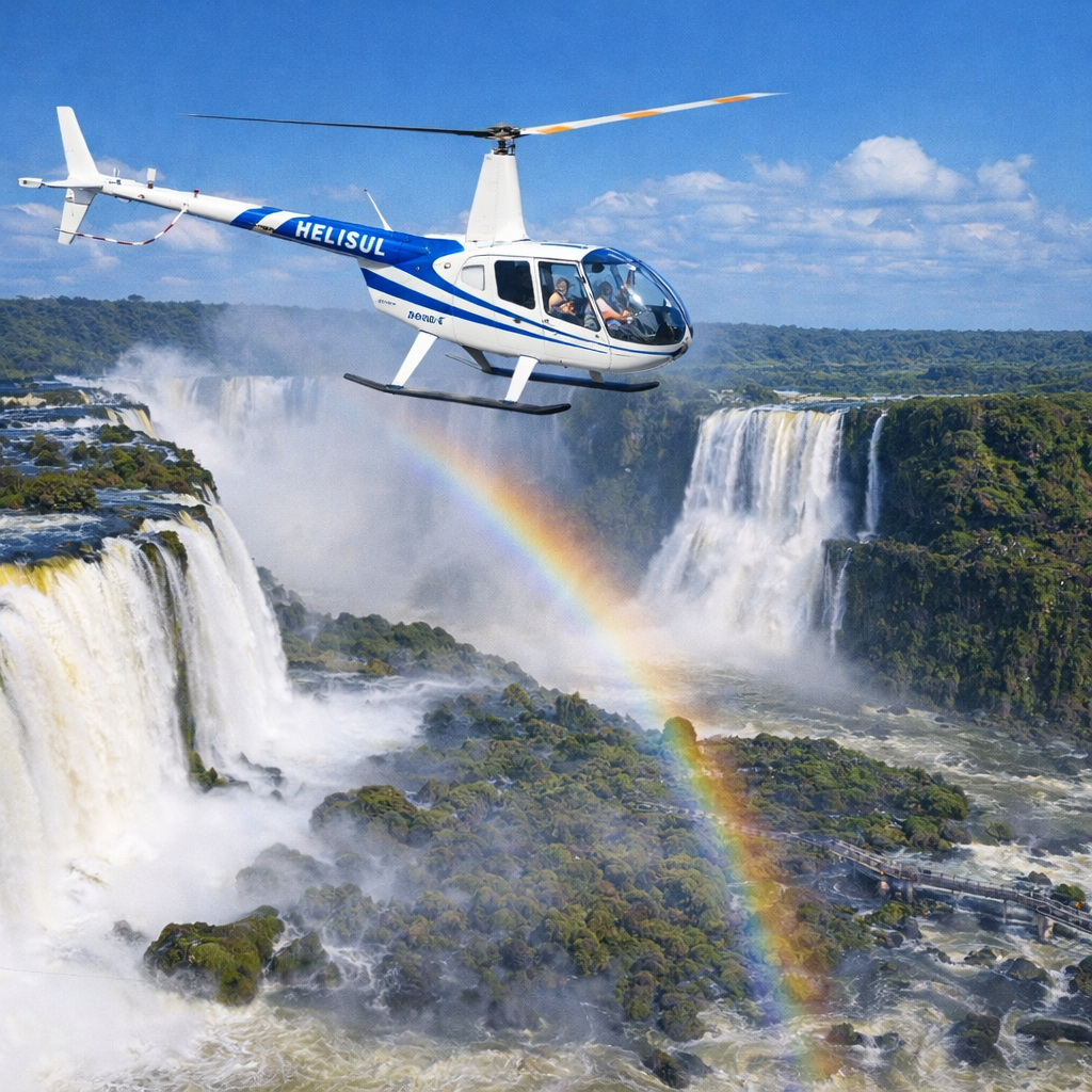 Uma experiência inesquecível sobrevoando as Cataratas do Iguaçu! O voo panorâmico da Helisul revela vistas espetaculares das quedas d’água, da imensidão do Parque Nacional e da Tríplice Fronteira. Emoção, exclusividade e paisagens de tirar o fôlego do alto.